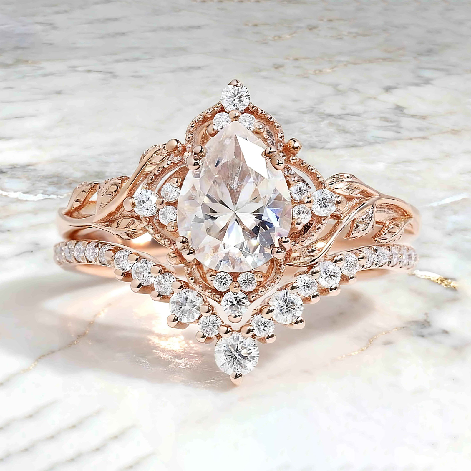 Nature Inspired Leafy Moissanite Engagement Ring Set V Shaped Curved Wedding Band